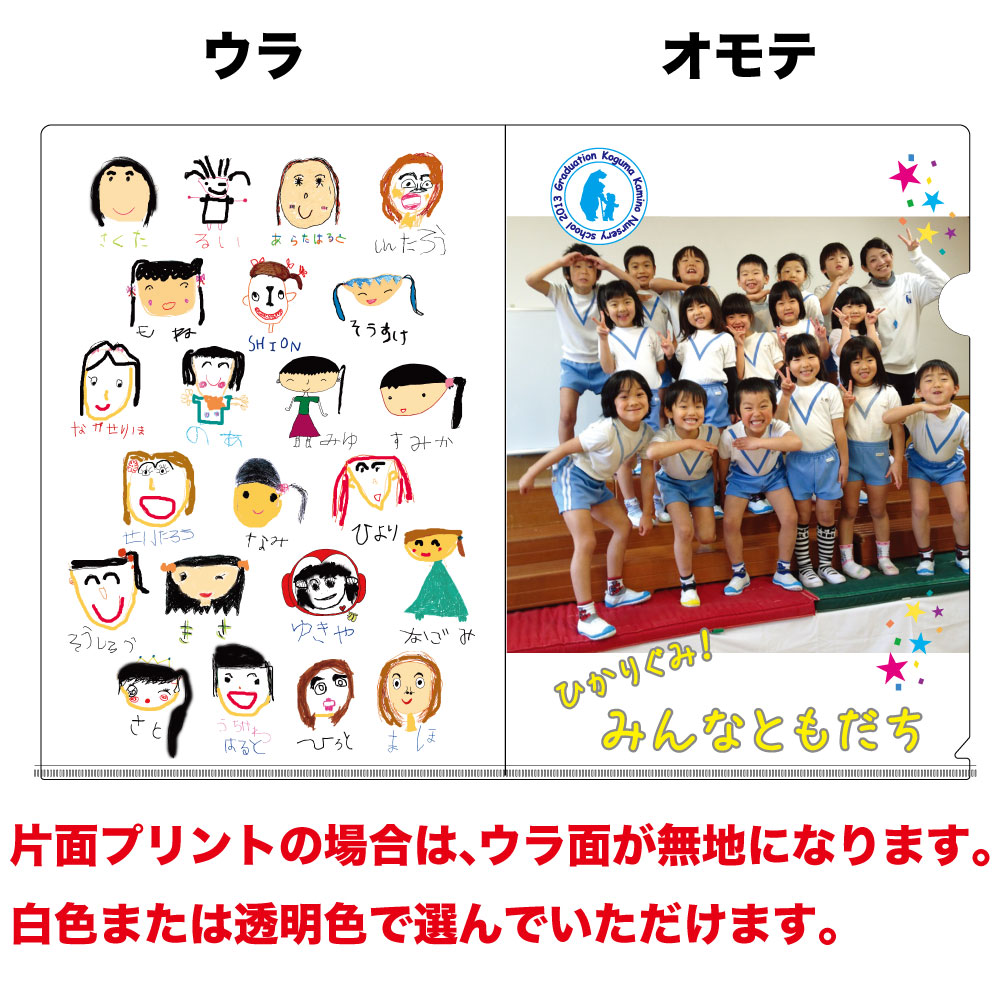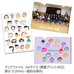 A4サイズの画像データをご提出いただくと10枚からオリジナルのクリアファイルが作れます。スマートフォンで撮影した写真にアプリを使って文字を入れたり、お好みのデザインに作成したjpg、png画像も高画質のものであれば使用できます。おともだちとのステキな思い出の1枚を記念に!実用的で「もう一品プラスしたい」というときにもおすすめです。