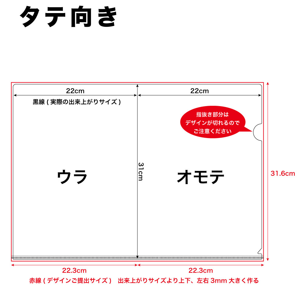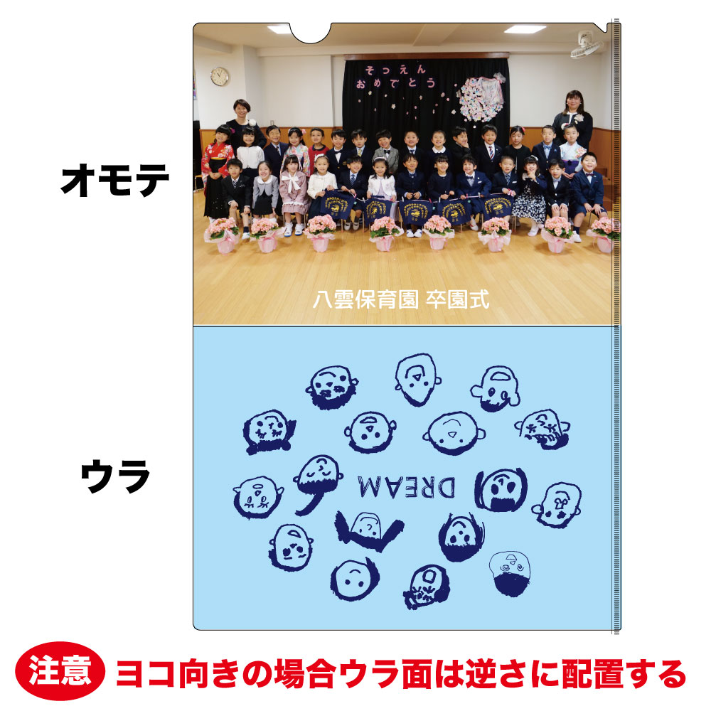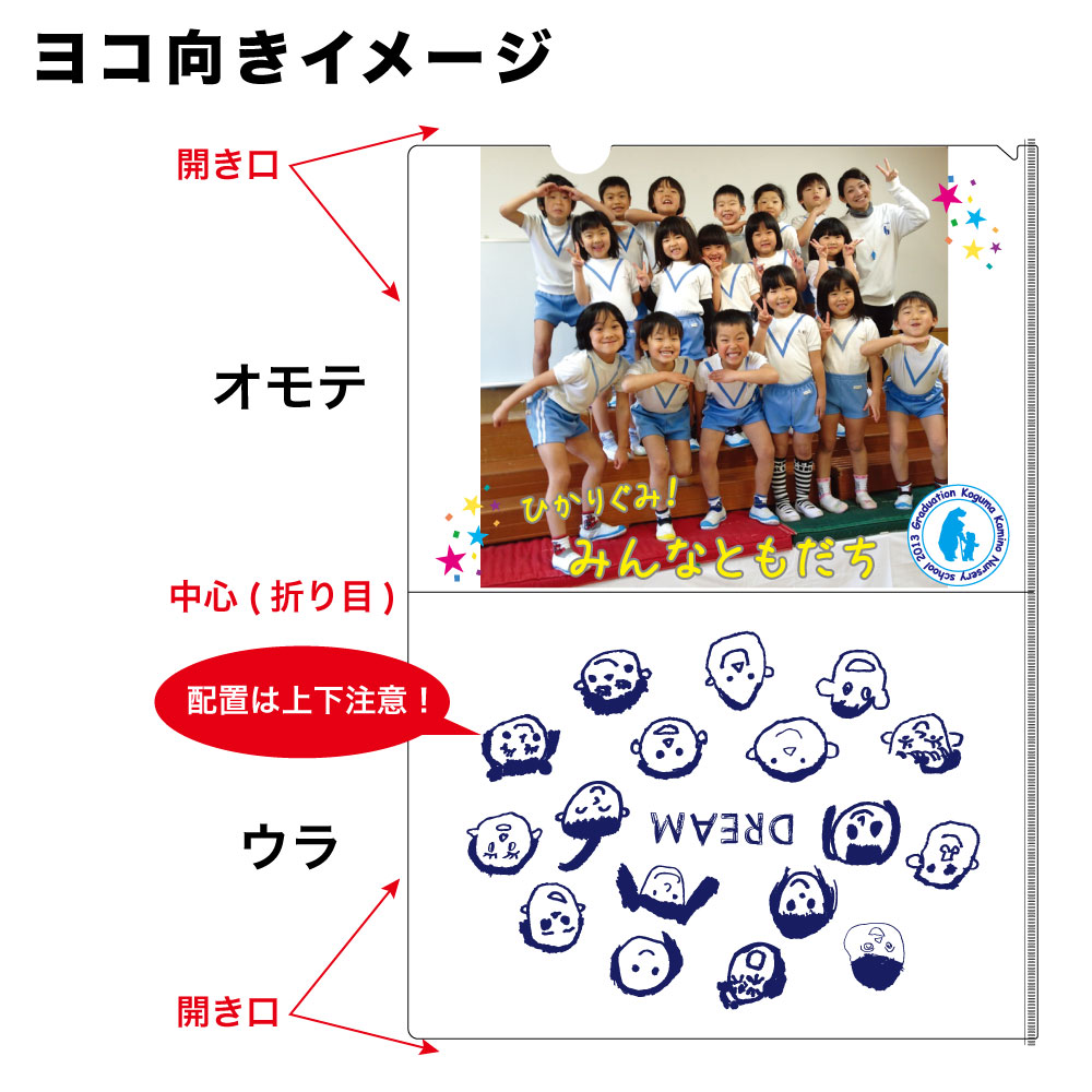 バッグ類・ランチョンマット・タオル等で使用したデザインを、そのままクリアファイルの大きさ(A4)に縮小して使用する場合は「オプション」料金はかかりません。ただし、デザインをプリント範囲に収まるように均等に縮小するため、縦横の比率で余白が出る場合があります。