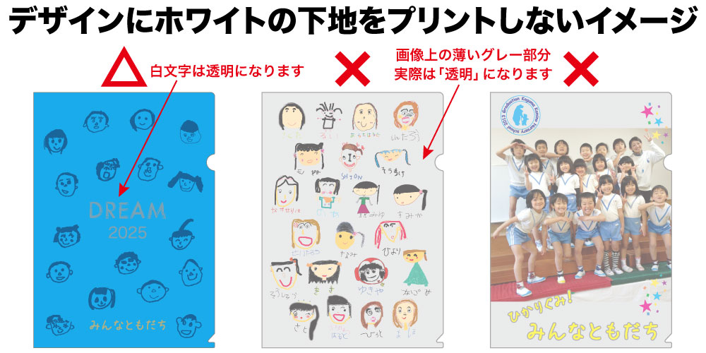 ホワイトの下地を入れない場合、ホワイト部分は透明色になり、ホワイト以外のカラーは透明感のあるクリアな雰囲気に仕上がります。カラーの手描きイラストや写真はホワイトの下地がないと透けるため発色が見えづらくなりますのでご注意ください。
